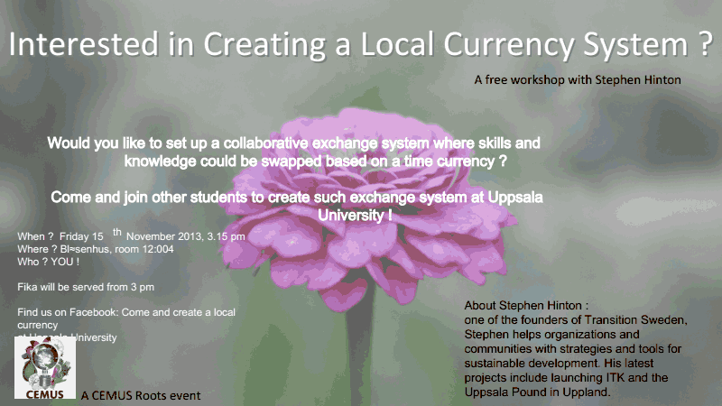 ISSS fellow Stephen Hinton recently led a complementary time-based currency workshop as part of a project to set up a student knowledge exchange at CEMUS, Uppsala University, Sweden.
