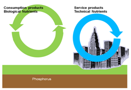 To make it even clearer, the service products are those that make up the technical infrastructure that the biological nutrients cycle within. Service products keep the technical infrastructure going. Consumption products, like food and fuel provide energy that is spent. We added the picture of the city to represent technical infrastructure.