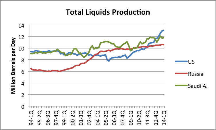 We frequently see stories telling us how well the United States is doing at oil extraction. The fact that there are stories in the press about the US wanting to export crude oil adds to the hype. How much of these stories are really true? If we believe the stories, the US is now the largest producer of oil liquids in the world. In fact, it has been the largest producer since the fourth quarter of 2012.