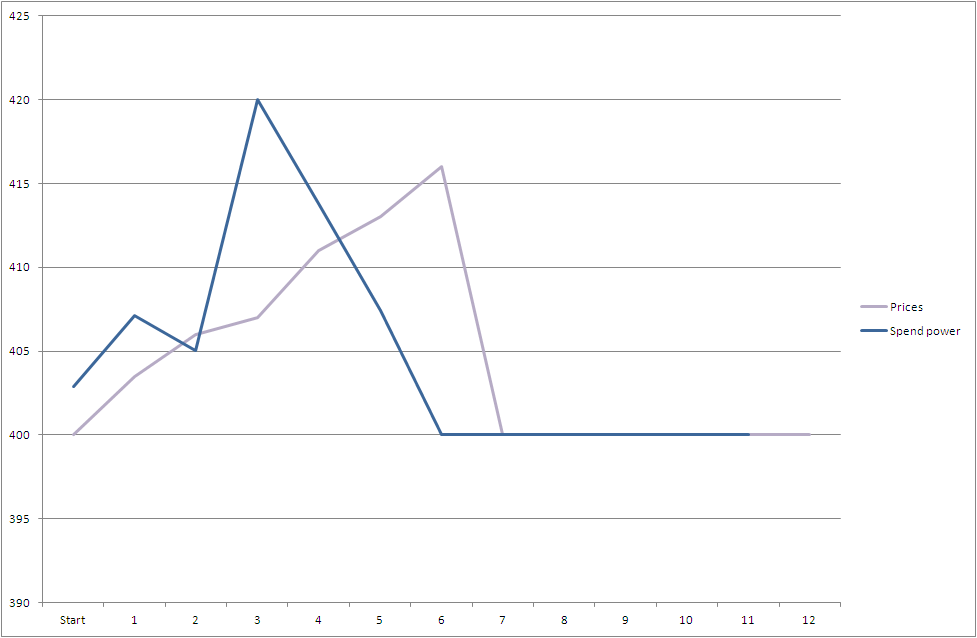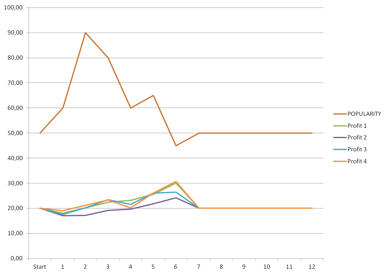This second graph shows profits: after the initial “hit” where the surcharges are first levied, most teams managed to get back to profitability, some reaching new heights. Popularity took a hit however. The initial jubilation over a government at last doing something about pollution waned as prices rose and targets were not met. Interestingly, popularity took a dive as profits rose.