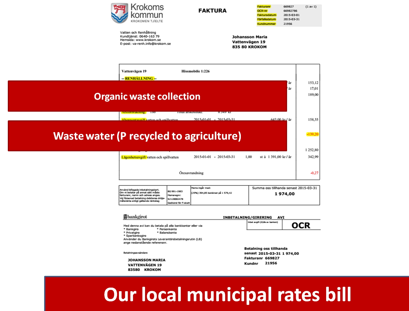 The other slide illustrates municipal services. We as citizens would like to see our organic waste collected and recycled. This is what one municipal bill might look like.