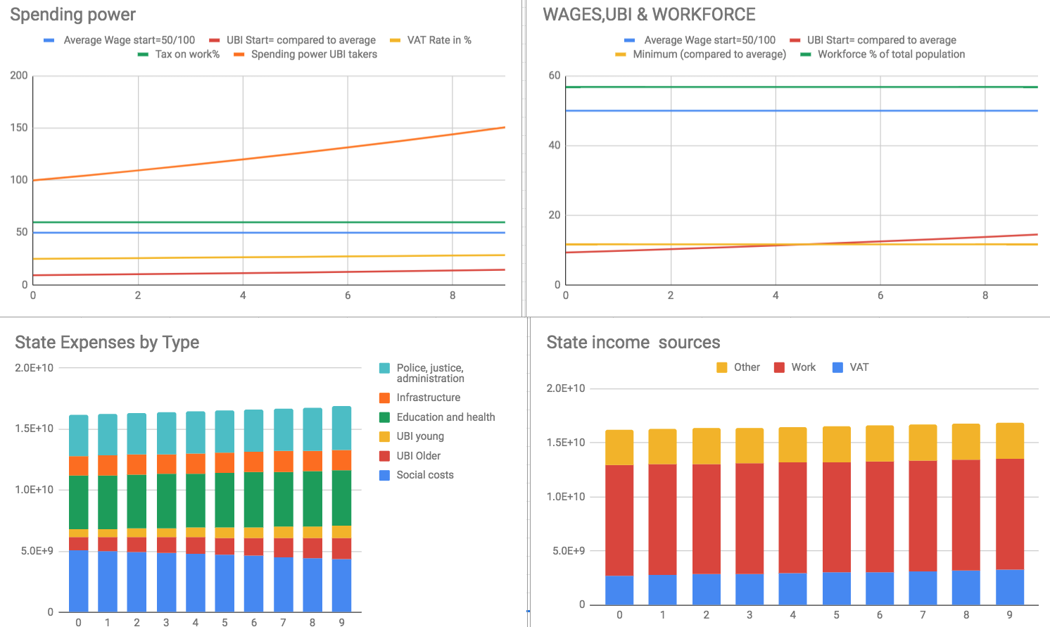 The second run added spending power of UBI takers to the dashboard. If you raise VAT you lower spending power. Interestingly – in the simplified model at least – you get MORE state income and the UBI takers do not get lowered VAT. This gives us a hint that it might be possible to raise UBI and Universal Basic Services, although the UBI eats away at the money available for social costs.