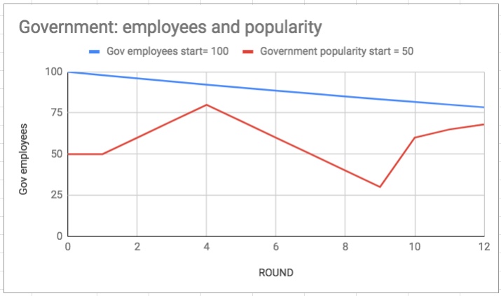 The above diagram is a graph following numbers in work. In this run we decreased employment by 3% per round. Youth is people 20 and under and we assume they are not in the workforce for simplicity of the game.