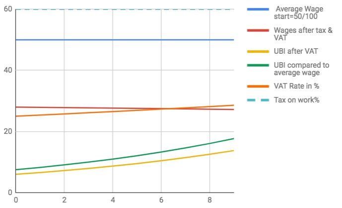 To demonstrate how decisions in the game show up in the graph engine, wages are given a start position of 50, and UBI and the minimum wage are plotted accordingly. VAT here is 25% at the start, raised at subsequent rounds, as is UBI. UBI after VAT and Wages after UBI are compared in this way.