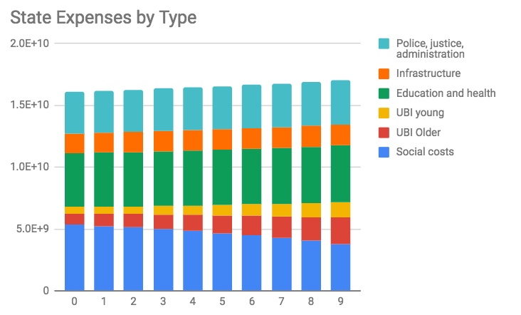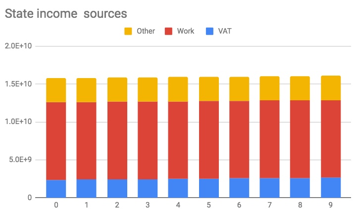 You will notice that State income increases when UBI is paid out. This is because the simulation takes into account that VAT is collected from UBI-takers spending their income.