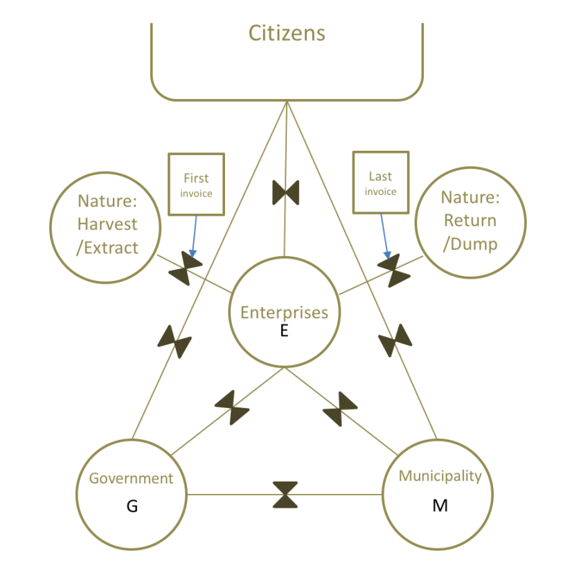 A step further in the model shows where natural resources – mineral and living – come in. The diagram above adds a” fifth” bathtub – nature – although no money goes to or comes from nature. Money arises in the bathtub of the firm, mostly, when the natural resource it extracts/harvests is sold on via the first and last invoice. It is firms, government or privately owned, that do the harvesting/extracting and returning /dumping back.