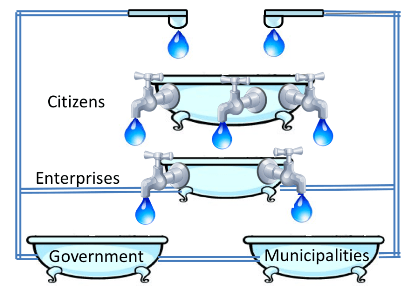 First a recap on bathtub economics – more information on that here. Bathtub economics says to understand how the economy works think of four bathtubs and money like water. The diagram below shows that, simply put, all money in the economic system in the hands – directly or indirectly- of citizens. This is because citizens own companies, cooperatives, and because even if there is money in government and municipal accounts, these accounts represent living beings – citizens.