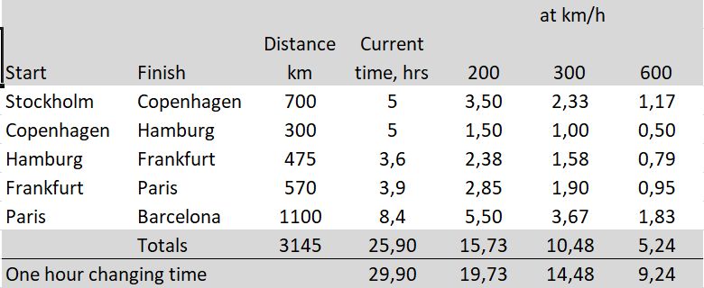 When you go to 600 kmh you are really talking. With minimum changing time you could get Stockholm to Barcelona in about 6 hours.