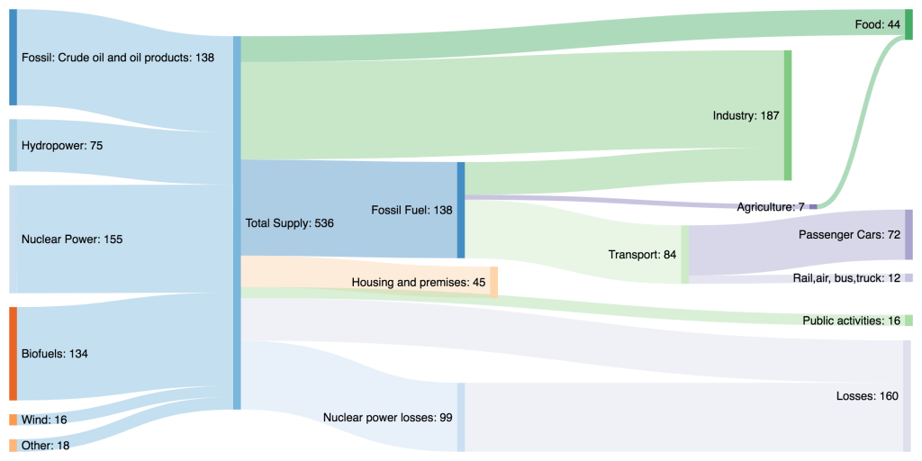 When you study it closely you see that the total energy produced is 536 TWh. Of that, losses amount to 155 TWh. The major uses of energy are in: