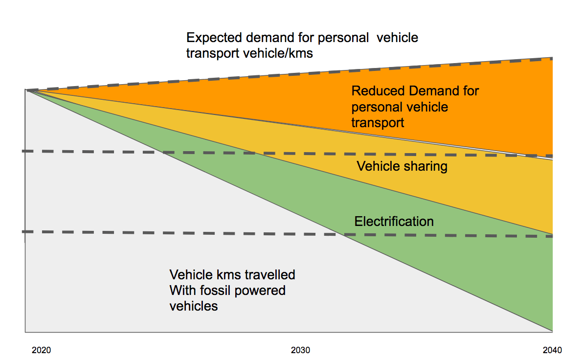 The diagram above gives a simplified model of how the transition can take place. The upper dashed line shows the projected growth in demand of vehicle-kilometers per year with no measures. The orange wedge shows the effects of a 30% drop in demand over time for personal transport. This can be achieved with various government measures including increasing public transport.