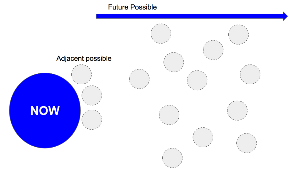This is where the adjacent possible comes in. The adjacent possible is something that we can more or less do now, it is a transformation or addition to something we have now and it would start to work immediately.