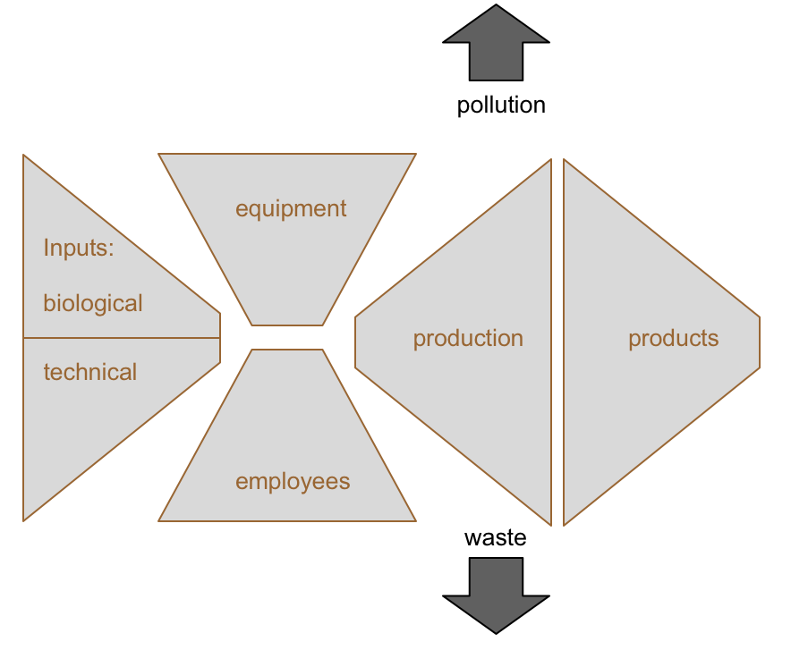 In the model above, working backwards, customers pay for products/services that have been produced by the firm’s employees using the firm’s equipment and inputs brought in from outside the firm.