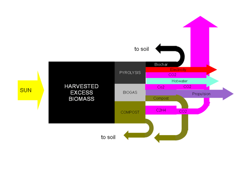 The diagram below shows a concept for the maximised use of biomass in a region/municipality. The driest fraction can by pyrolysis (burnt with a minimum of oxygen) to produce biochar and heat. When returned to the soil, biochar effectively sequesters carbon for thousands of years and enhances the soil, especially when combined with nutrients. Burning biomass produces and heat and can be used to produce electricity.