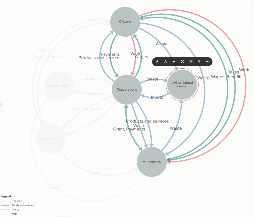 The first thing to notice is that the government is greyed out. This is because it is a greater number of connections away. Citizens are implicated because they release carbon dioxide from their purchase of fossil fuel and this goes to the living capital. You can start to see the connections clearly. If firms did not sell fossil fuel to citizens, then they would not burn it in their cars. Notice too the proximity of the municipality in the diagram. In its relationship which is one of service provider and fee collector and authority it has the potential to manage flows of material between the other entities.