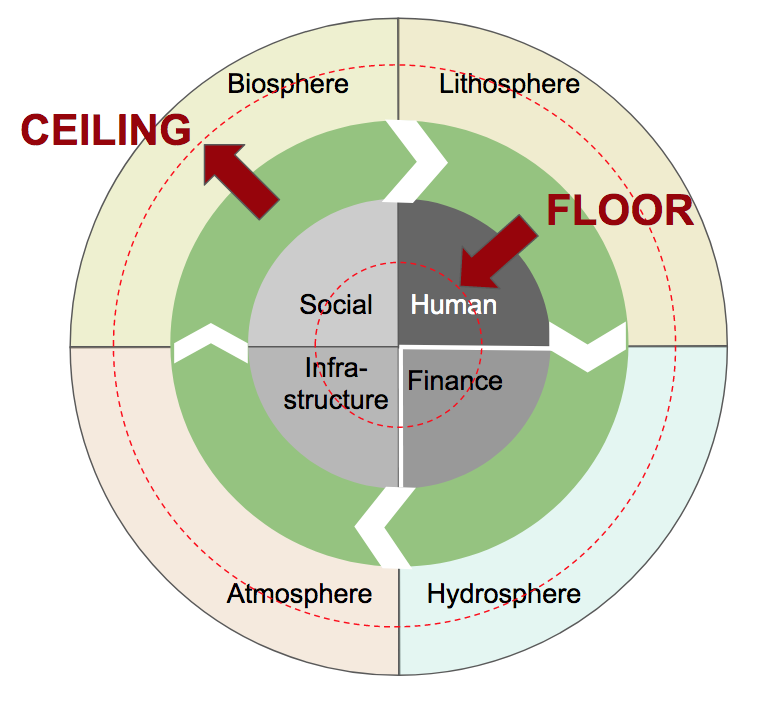 Seen from the point of view of real capital – where material circulates – the reasonable space of the Doughnut economy is to ensure all the capitals remain intact or indeed where needed are regenerated.
