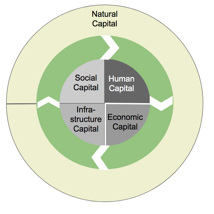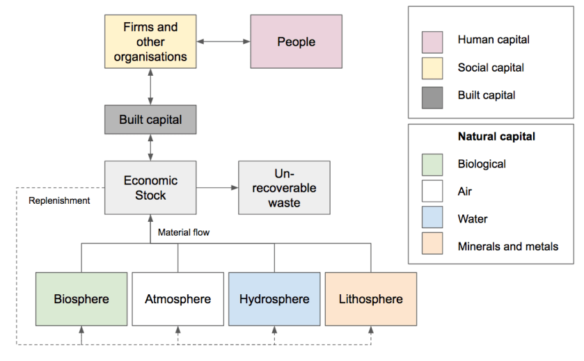 Materials flow from natural capital through the built capital of firms (firms are social capital) to provide products and services to people (human capital) who in turn are provided their labour to the firms. From being in use in the production system, the material flows back to natural capital stocks.