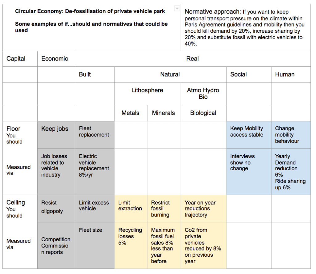 We took the example above of the supply chain for personal mobility that can be the source of carbon dioxide emissions several times larger than those stated by manufacturers. Let us pursue the example, again with a rough rule of thumb approach for simplicity to aid clarification, to see what policy implications that might arise and to explore the question of measuring what matters in this case along with identifying the appropriate ceilings and floor. The table below gives examples of how this multi-capital analysis can proceed.