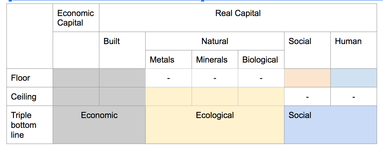 Several researchers include economic capital as real capital. Indeed, the triple bottom line approach puts built capital in the same category as financial capital. There can be some logic in doing this: before the firm can start trading or indeed producing, it needs to have purchased or otherwise acquired the machines and equipment needed. This requires a sum of money often coming from the owners at start-up. In this way, the money is not used up, rather the owners will get it back (hopefully) when they sell their shares. A summary table below shows how these all these concepts hang together.