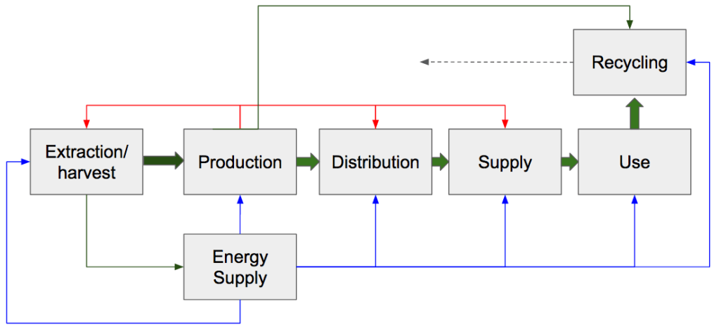 Each step in the supply chain typically involves inputs of materials and energy, outputs of materials to the next step, and finally waste /recycling.