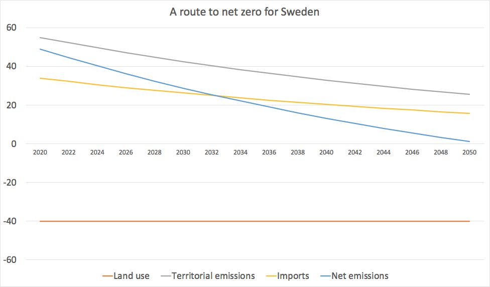 Assuming that Swedish nature cannot absorb any more, and the date set by the EU for net zero is 2050, you are looking at a reduction of 5% per year.