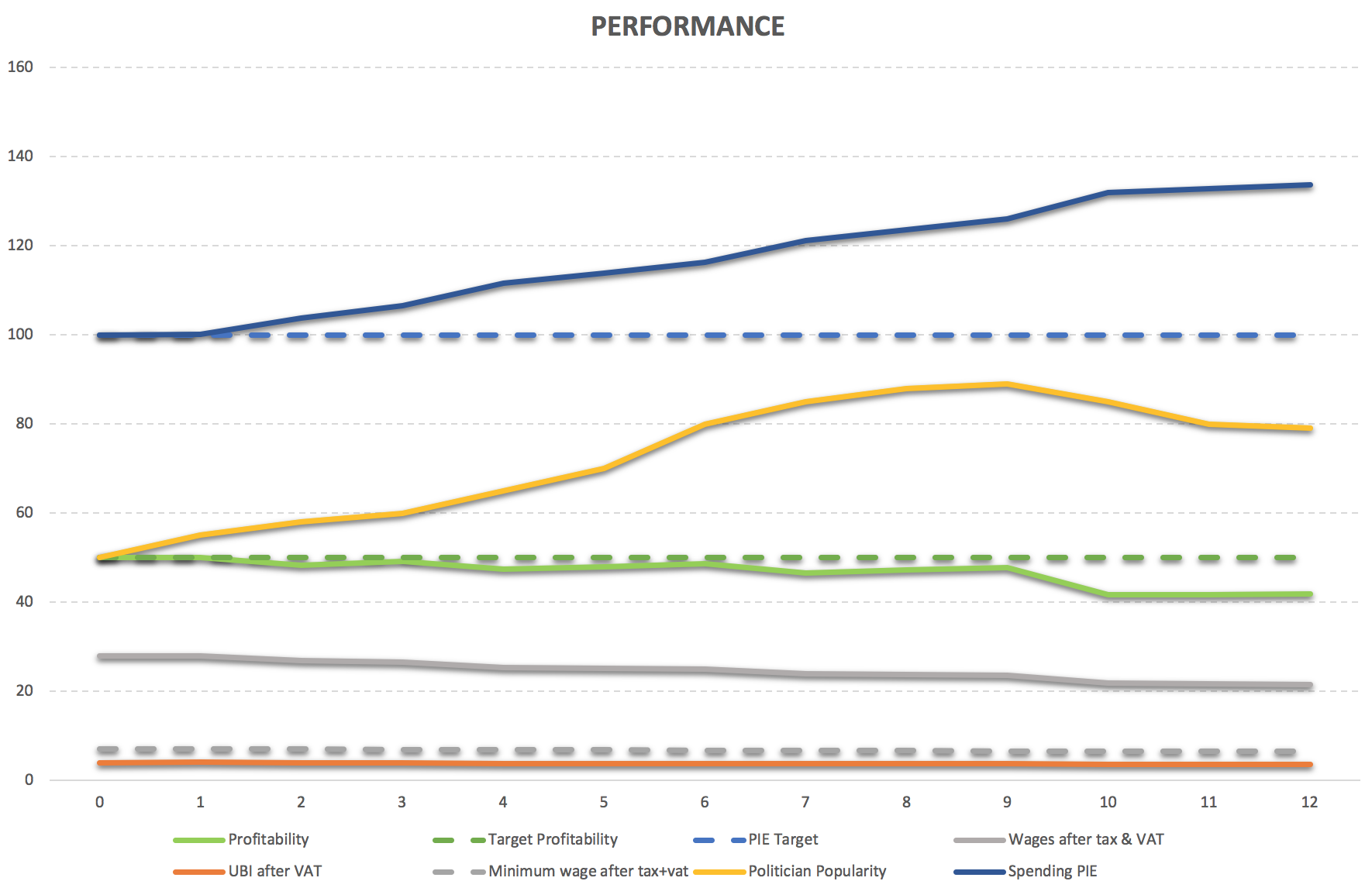 Above: Screen shot from one of the graphs showing partial success in increasing public spending and politician popularity, but failing in other categories – we wonder how they got THAT result?