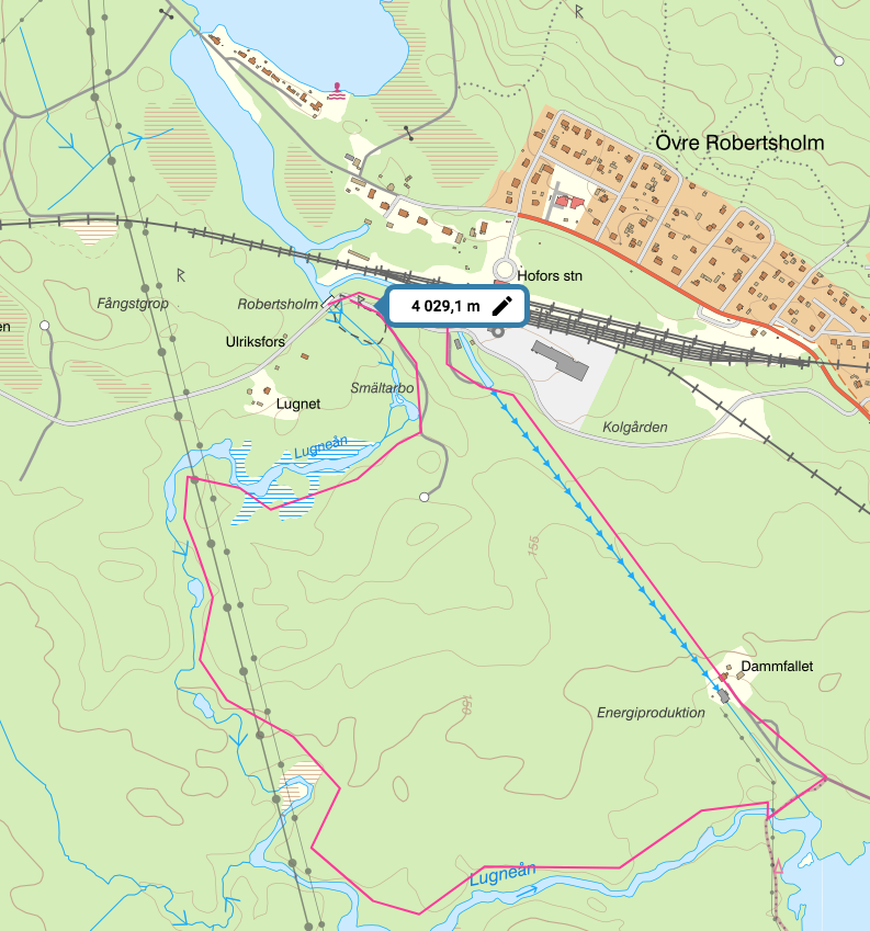 One possible round route of 4 km following the river Lugneån that feeds into the river Hoån and the hydroelectric installation that provides Hofors with electricity.