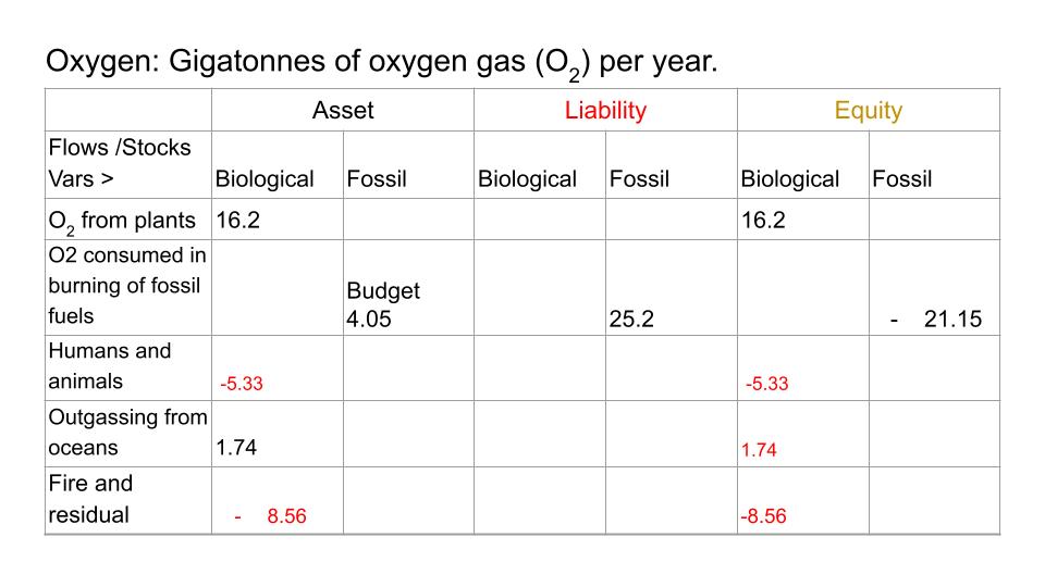 Atoms are common pool assets. They are real capital as they are not used up. The living layer that emits oxygen is also real capital as this is not used up. What might be used up is the capability of the living layer to provide oxygen. The function of oxygen provision, a real capital function, could be compromised. There is a limited amount of oxygen atoms on the Earth, and a certain proportion of these atoms are in the air at any one time. So too is fossil carbon, contained in oil. The atoms might be real capital, but the energy in oil is not. When oil products are burnt, the carbon atoms remain as carbon, the energy in the fuel is used up.