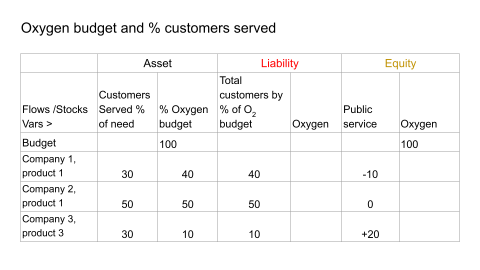 The table below is a high-level thought experiment. If companies are going to use the public commons, then surely they should do it primarily for a public good. The table below shows how much of the oxygen budget is used up compared to the percentage of customers served. In the thought experiment below, one product is produced by two companies. Company 1 is less efficient, as by % of resources used should serve 40% of the population in need and it only serves 30. Company 2 is spot on. Company three serves another need with product type 3 and only uses less than a third of its allocated budget.