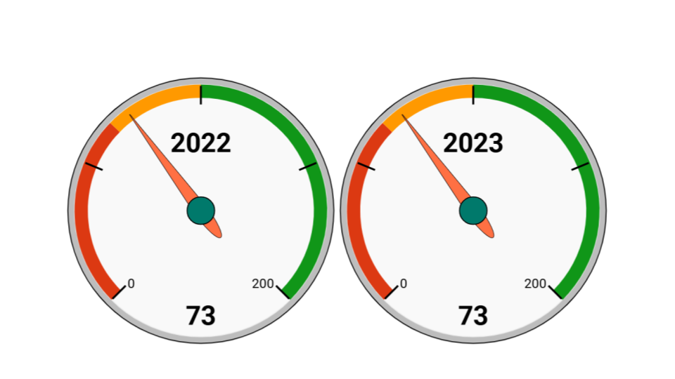 The next step is to construct trend lines. We chose to use the gauge graph for the last two years when data was available. We set the normative as the straight line towards zero in 2045. The score of 100% is calculated as follows.