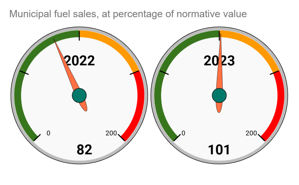 What we learn from this exercise: all three elements of the graph are useful as they show us that fuel sales are falling at a trend that is faster than the normative line of steady decrease to 2045. However, the last few years have seen a sharp increase from a previous low. The long-term trend is still within the normative.The gauges show that the year from last was under the normative, and the last year was just slightly above.