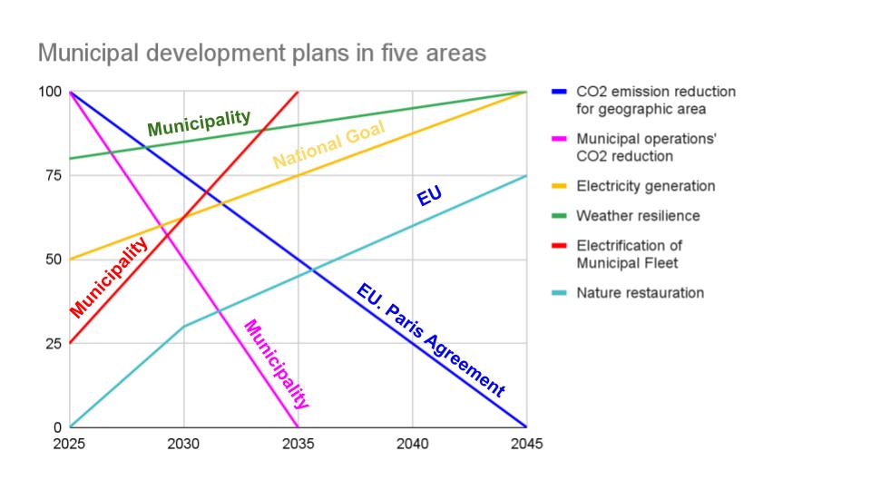 The aim is for the municipal geographic area to be net zero by 2045. This is mapped as going from 100 today, (which represents CO2 emissions from fossil burning 2024), to zero in 2045. This is a national goal, based on Sweden’s Paris commitment.