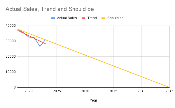 The advantage of the straight line approach is that is would allow politicians to see that if the actual result is under the line, the transition is on track. The example below shows the fossil fuel sales in the municipality against the trajectory to fulfill Sweden’s Paris commitments.