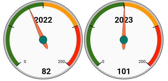 This might be sufficient for politicians. Another approach is to try gauges. In this case, 100% is “should be” and the dial shows the gap. The dial shows green when sales are under, and yellow/green when it is over.