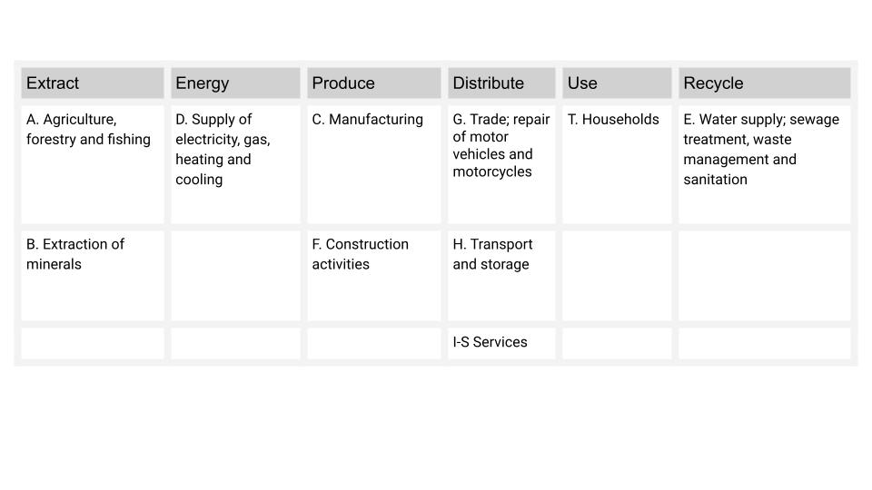 According to SNI 2007, Sweden’s economy can be divided into two groups: Extraction (A&B) and material use (C,D, E, F, G, H, I-U)
