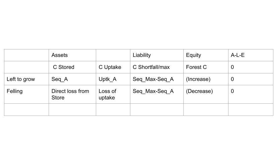If we see the shortfall in carbon uptake by the forest as a liability (on humanity) and the actual uptake as equity, we can start to model this in accounting terms.