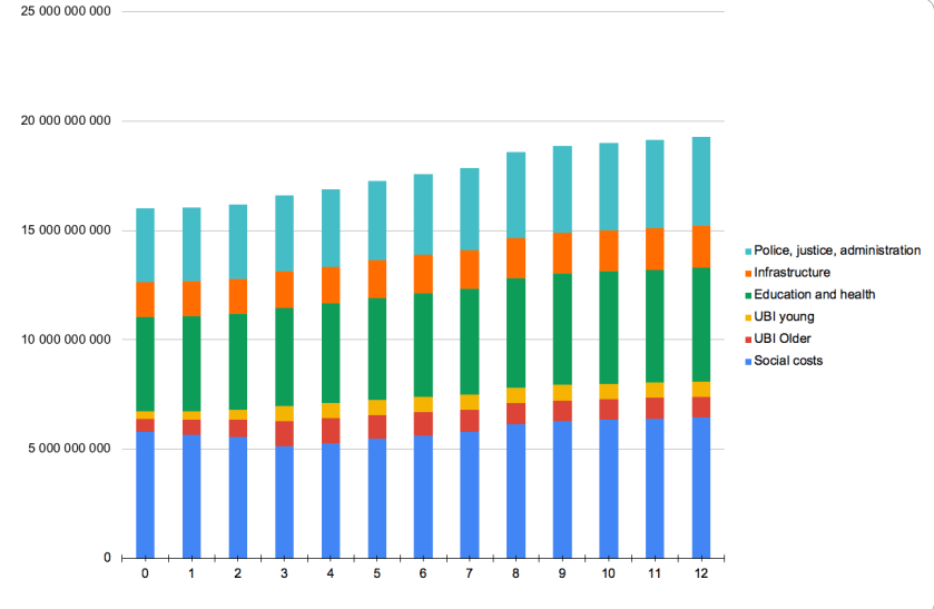 shows State Expenses. In this simulation UBI comes from the allocation to social care, and is shown as UBI for the youth (50% of adult amount) and UBI for adults.