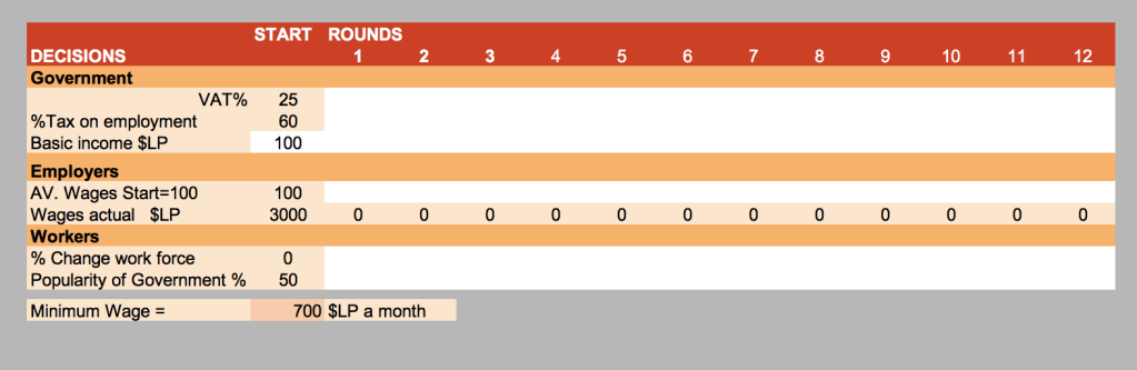 Round one starts with the Government decisions, one person can enter the figures into the appropriate squares.