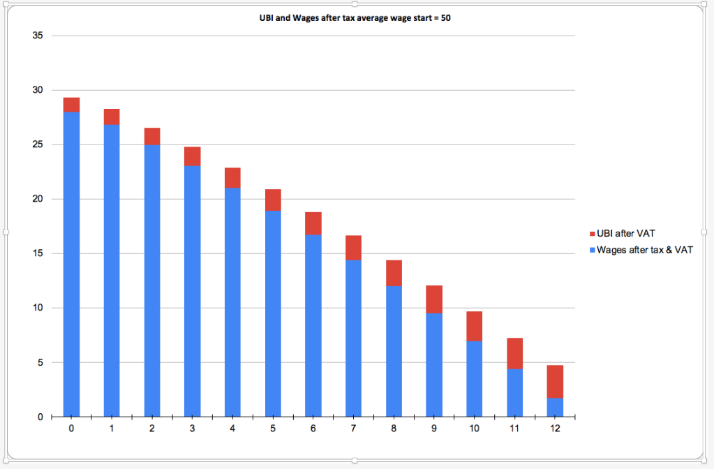 shows the relative amounts of money spent from wages and UBI after tax. These are affected by wages, taxation levels and the number in UBI.